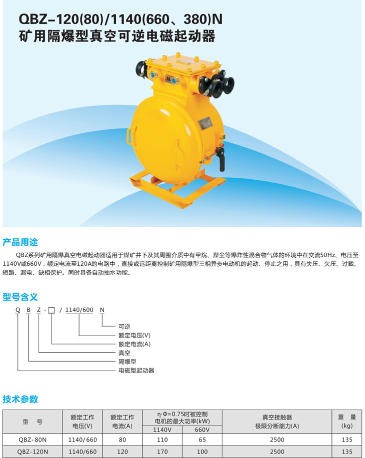 產品總匯>QBZ-120(80)/1140(660、380N)礦用隔爆型真空可逆電磁起動器